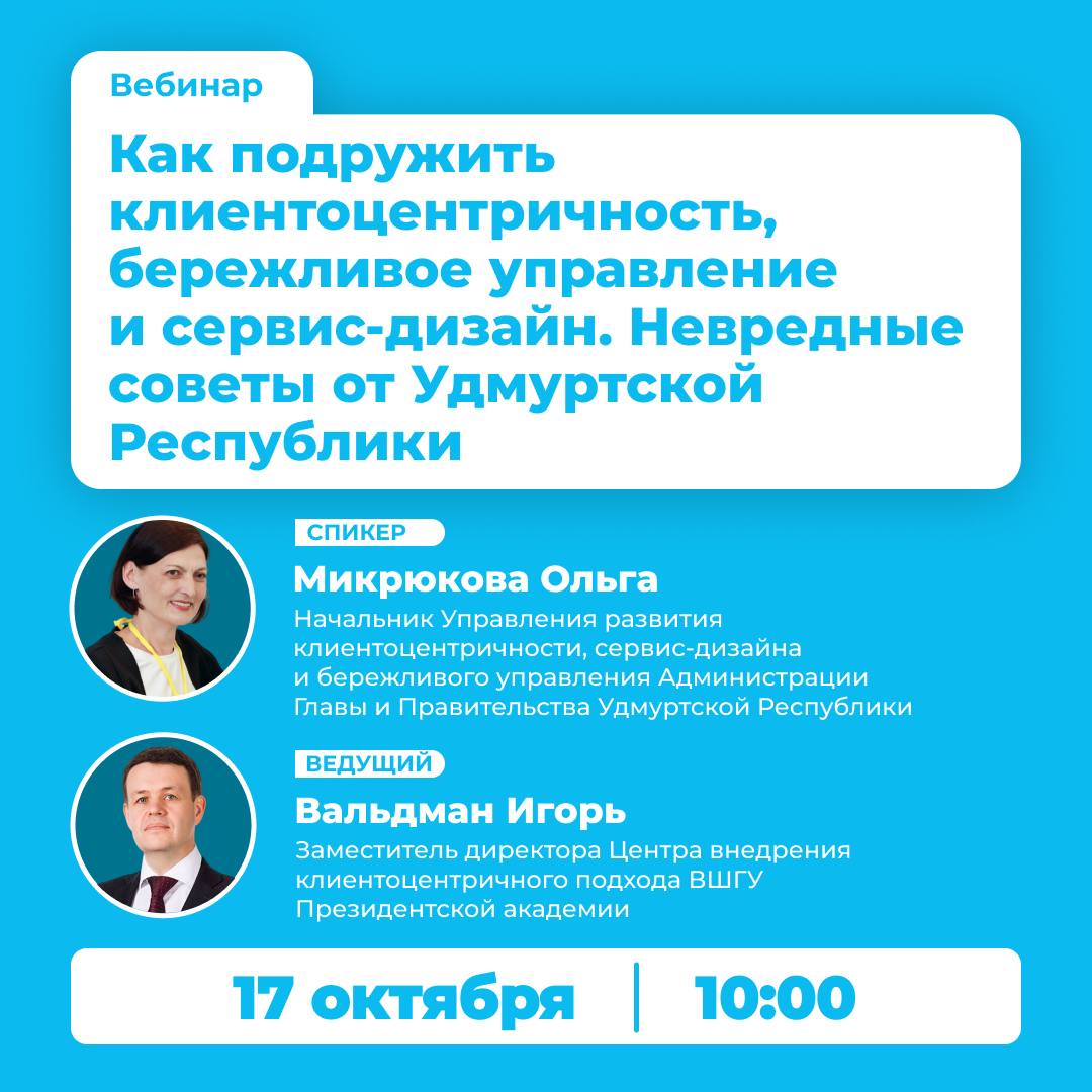 17 октября (в пятницу) состоится открытый вебинар “Как подружить клиентоцентричность, бережливое управление и сервис-дизайн. Невредные советы от Удмуртской Республики”.